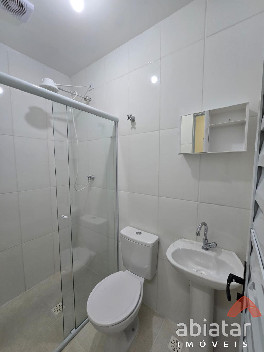 - Banheiro com espelho, pia com torneira, box e chuveiro