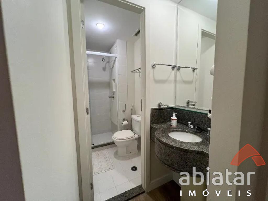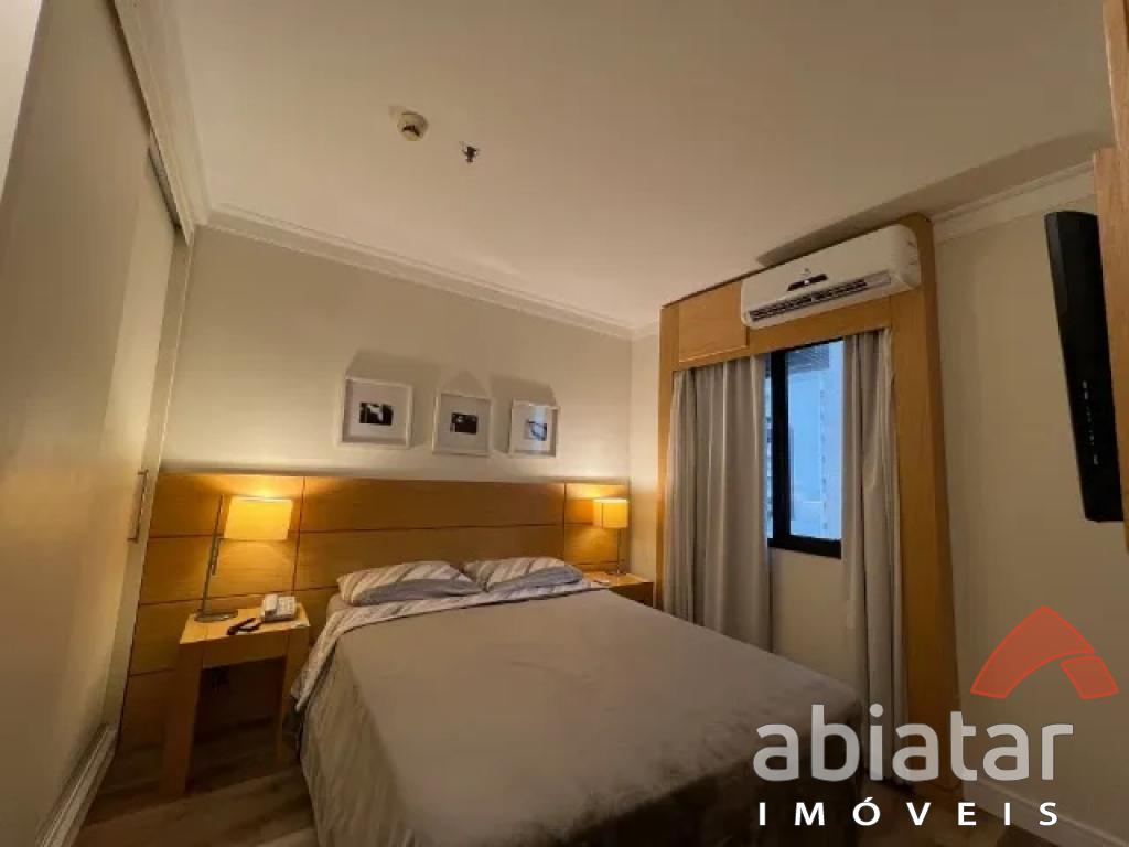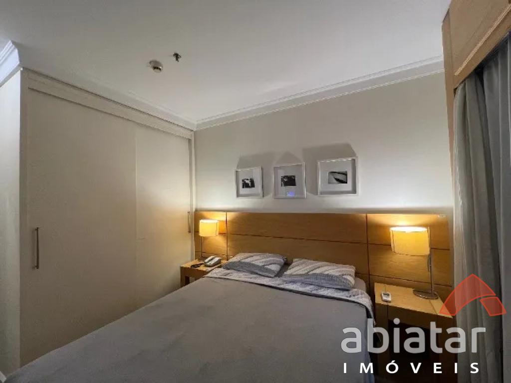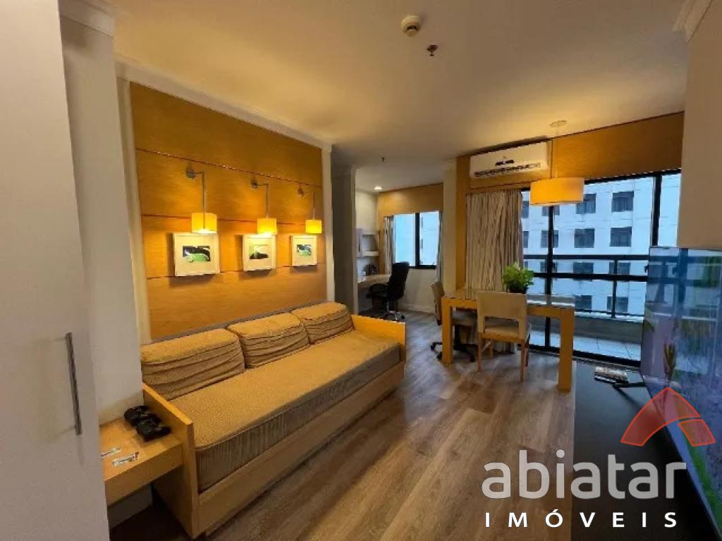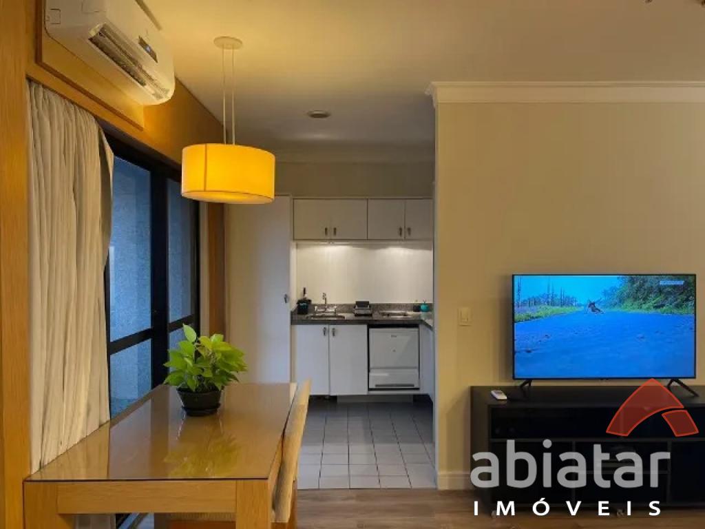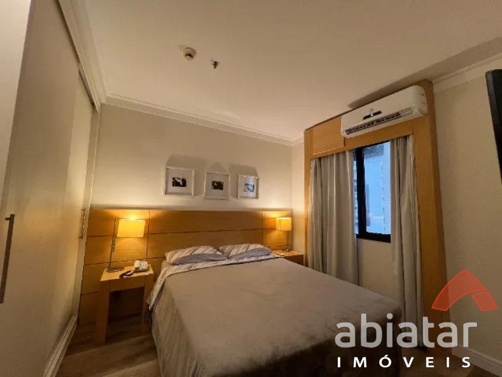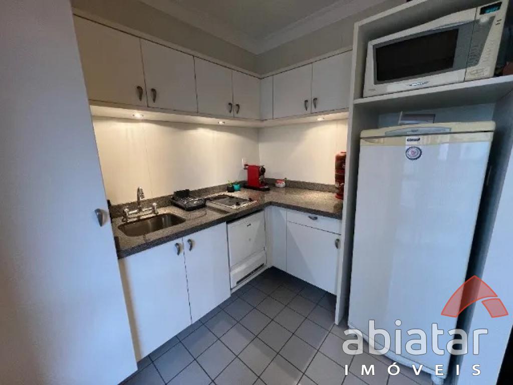 Flat mobiliado c/ cozinha completa: cooktop indução, geladeira, microondas e máquina lava louças; - 1 dormitório c/ guarda-roupas, TV e ar-condicionado; - Janelas e porta varanda anti-ruído;